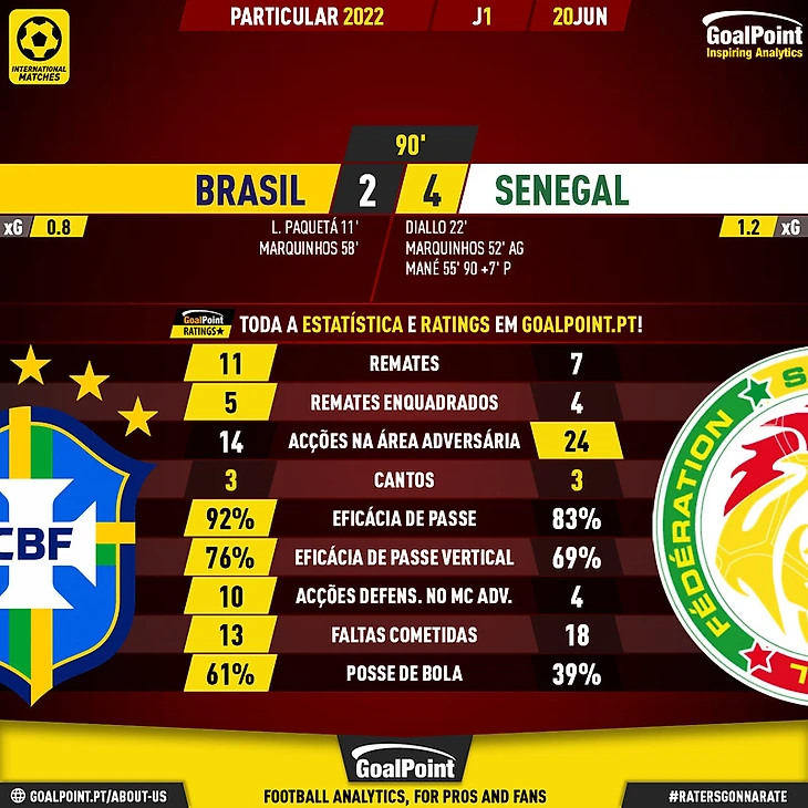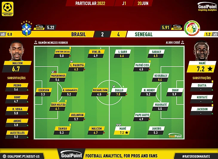 Селесао начала матч с Сенегалом предсказуемо-Рамон не стал ничего менять, видимо решив что разгром гвинейцев при отсутствии игры-индикатор правильности его пути. Повреждение Каземиро как ни странно сыграло на руку сборной. Наконец-то вышел в старте Бруксо. И самое главное,что мне понравилось-команда пыталась, и иногда это неплохо получалось, играть в комбинационный футбол. При этом сочетали мелкий перепас и длинными точными забросами на фланги, и будь Винисиус чуточку повнимательней с линией офсайда, могла бы решить исход матча в свою торону уже в первом тайме. Сенегал был хорош, но на горе бразильцам хорош лишь в эффективности реализации своих шансов.