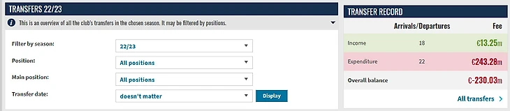 Трансферный баланс 2022 - (230.03). Из них покупки на (243.28) и продажи на 13.25
