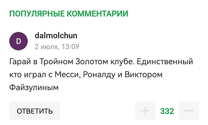 На Sports.ru завирусился комментарий пользователя dalmolchun. Он выяснил удивительный факт: оказывается, а мире есть один футболист, которому посчастливилось сыграть в командах с Лео Месси, Криштиану Роналду и Виктором Файзулиным.