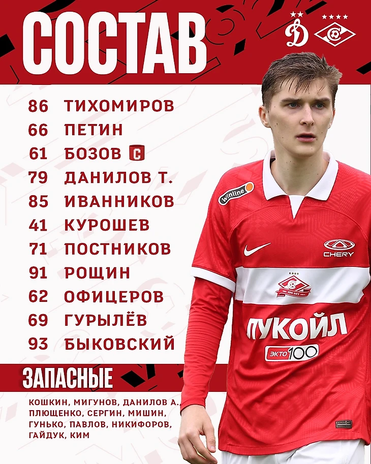 Состав. Капитан молодежки Никита Бозов, который в последнее время тренировался с основой, на игру вернулся в состав дубля. «Спартак» начинал встречу по схеме с четырьмя защитниками; в опорной зоне расположились Никита Постников и Дмитрий Курошев.
