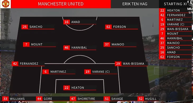 В первом тайме Эрик Тен Хаг выпустил максимально возможный основной состав. Лично я предполагал лишь то, что вместо Форсона выйдет с первых минут норвежский тинейджер Хансен-Ароэн, однако он появился в составе с резервистами во втором тайме. Хотелось бы теперь сказать пару слов о игре команды в первом тайме в целом, а потом пройтись по каждому игроку индивидуально. В первую очередь отмечу, то с каким желанием играла команда, особенно это было заметно по игрокам академии. Видно то, что игроки понимают, что при качественной работе и качественному выполнению своих задач на поле, они получат шанс от тренера в сезоне. Мы же не должны в этом сомневаться. Так было в прошлом сезоне конечно же с Гарначо (да, он дебютировал ещё при Рангнике, но вспомните прошлую предсезонку: все видели, что парень очень талантлив, но мало кто мог предположить, насколько важную роль он может сыграть в сезоне), с Кобби Майну (хоть он сыграл совсем немного в прошлом сезоне, но практически всегда был в обойме основной команды), с Зиданом Икбалом и даже с Чарли Макниллом до его ухода в аренду зимой.