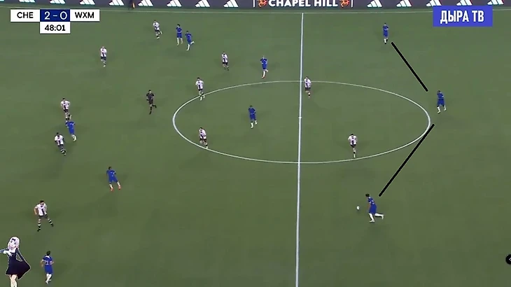 Нельзя пройти мимо смены схемы в перерыве. «Челси» перешел на гибридный вариант. В защите по-прежнему это была схема 4-2-3-1, а атаковал же Челси уже с 3 защитниками.