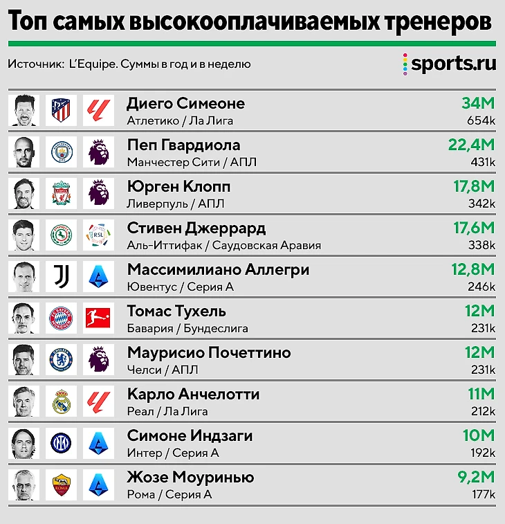 Наверняка к концу лета топ еще изменится: саудовцы предлагают роскошные контракты многим европейским тренерам – Моуринью отказался от 60 млн в год. Кто-то согласится и на меньшие деньги.