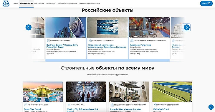Если на официальном сайте Mapei зайти в раздел Iconic Project (то есть самые значимые объекты, где работала компания или где применялись ее материалы и технологические решения), то на первой же странице можно увидеть очень известные здания и объекты – Большой Кремлевский дворец (компания укладывала паркет в Андреевском зале, где проходят инаугурации президентов РФ), Храм Христа Спасителя, Останкинская телебашня, Парк Зарядье, Сочи-Парк. Хватает и спортивных объектов: практически все стадионы, построенные в России к ЧМ, включая «Газпром Арену» и «Лужники», а также Академия тенниса в Казани, Дворец водных видов спорта в Екатеринбурге.
