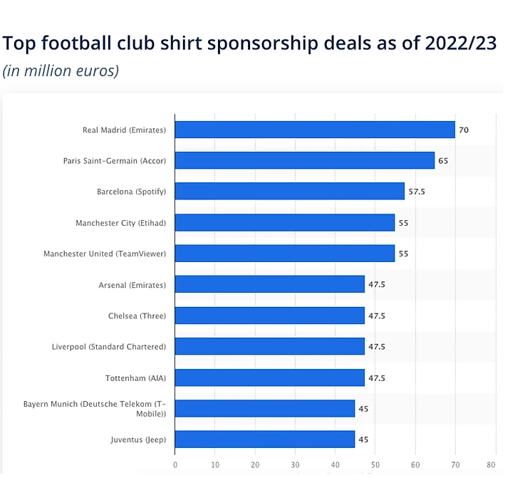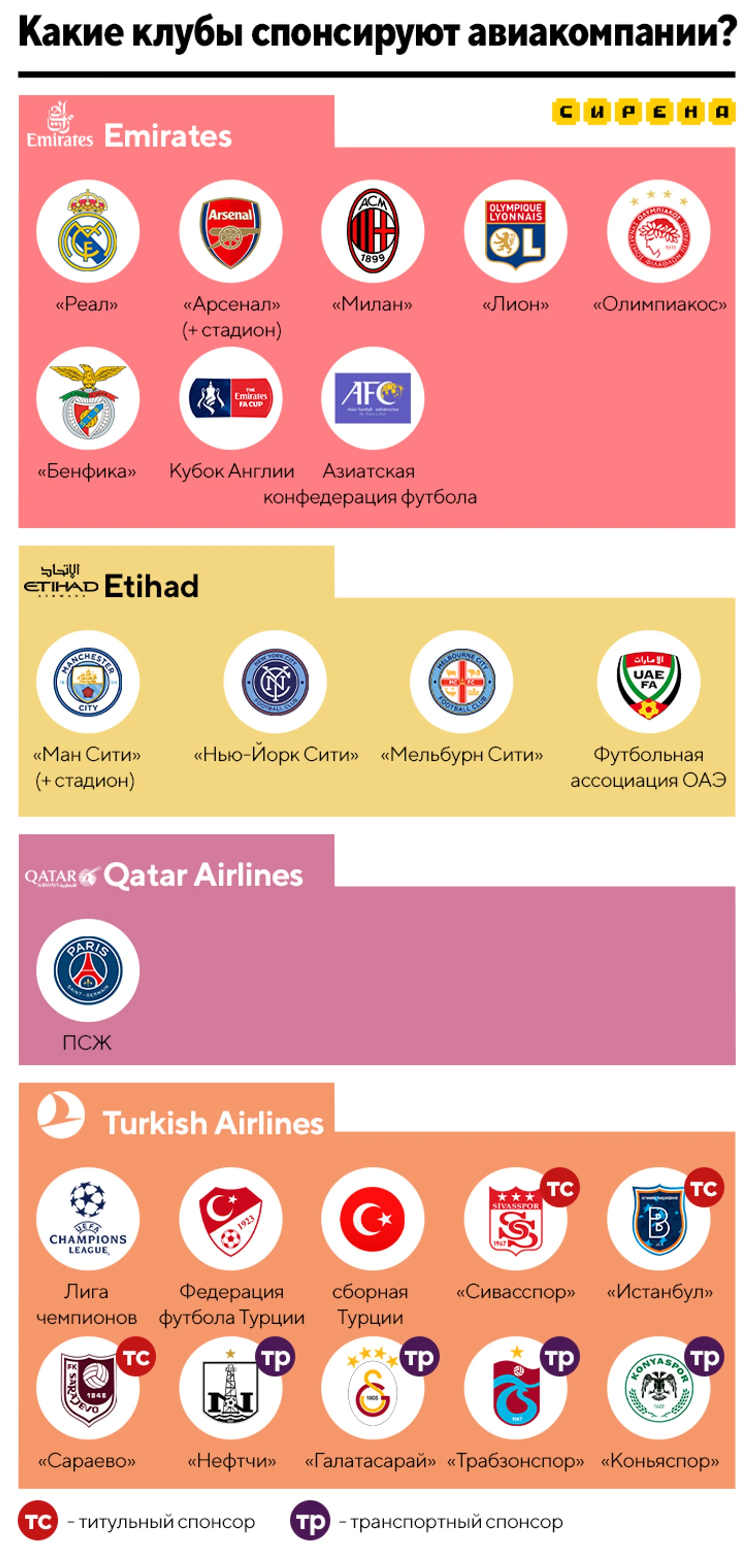 И да, авиакомпании реально щедро платят. В топ-10 самых дорогих сделок с титульными спонсорами – четыре контракта от авиакомпаний. Больше всех зарабатывает «Реал» – 70 млн евро в год от Emirates. На втором месте «ПСЖ» и Qatar Airways (65 млн).