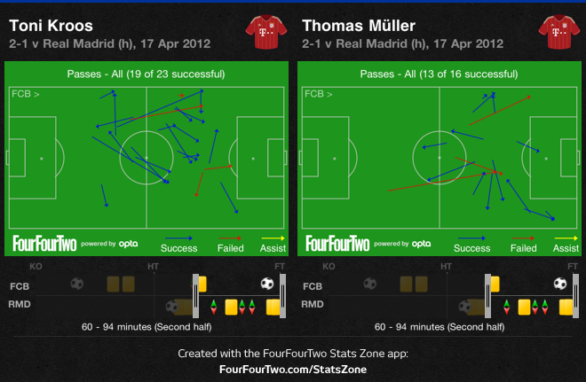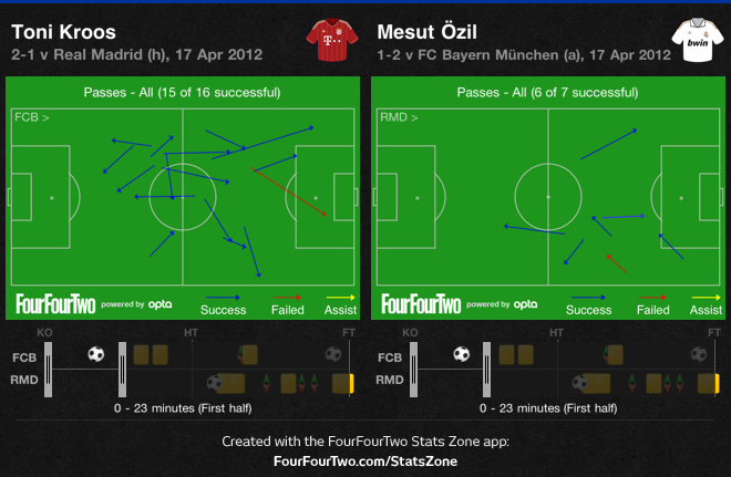 "Бавария" полностью контролировала центр поля. Моуринью понял, что это проблема. И в середине первого тайма сместил Ди Марию с фланга в глубь центра поля, где он помогал Алонсо и Хедире. Таким действием, Моринью освежил центральную зону. После, игра выровнилась и "Реал" имел небольшое позиционнное преимущество.