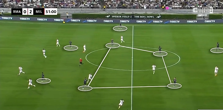 Переход на модуль с ромбом не ограничились обычным позиционным перестроением со стороны игроков «Мадрида» — меняется сама концепция игры. Теперь «бланкос» предпочитают гораздо больше нагружать центр, а не фланги, пытаясь создать свободное пространство в полуфлангах соперника за счет постоянного движения трио Беллингем-Родриго-Винисиус в финальной трети.