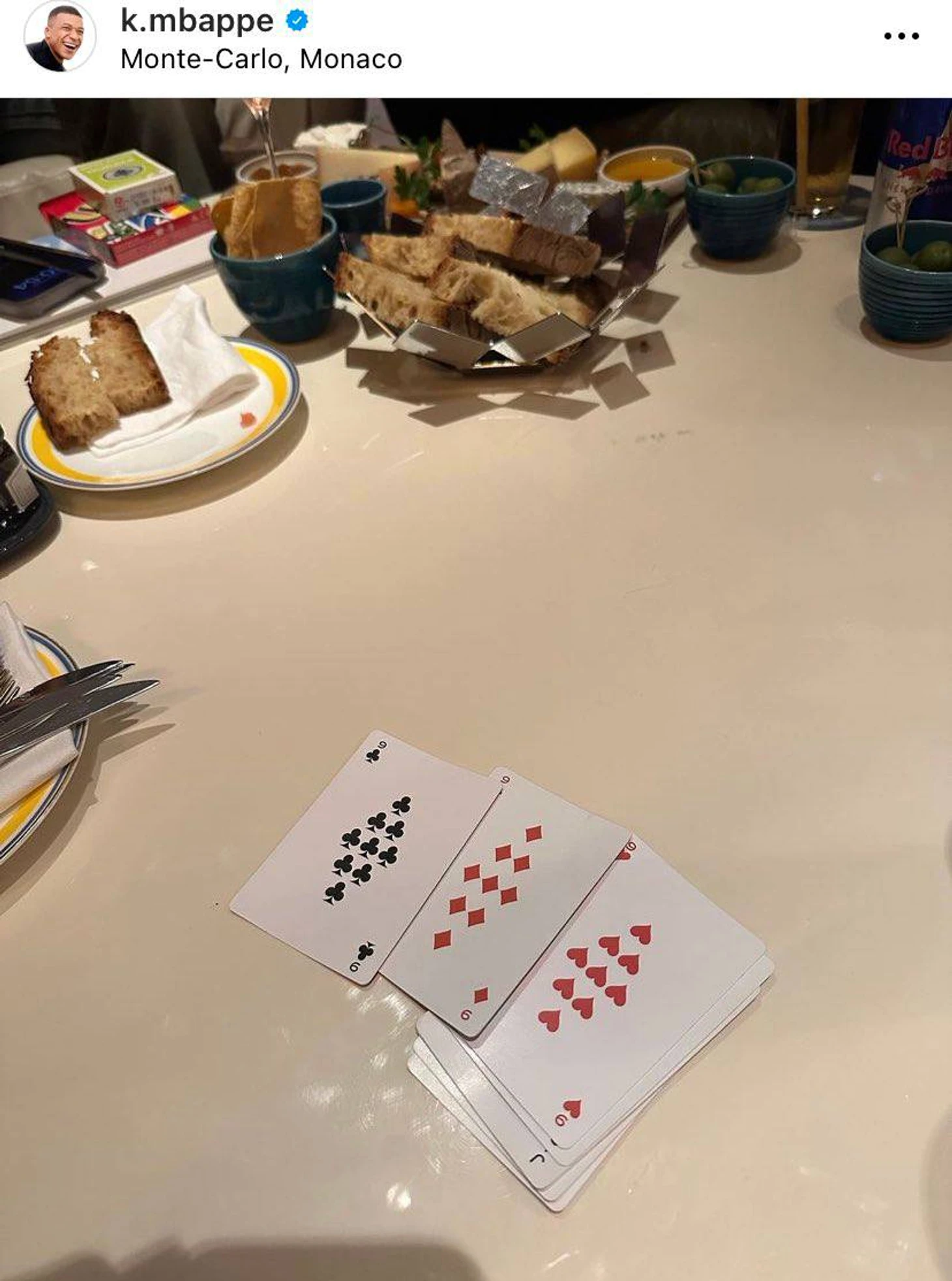 2. Представлены три девятки. Не хватает девятки пик. Девятка пик в гадании на игральных картах символизирует проблемы. Отсутствием девятки пик Мбаппе хочет показать, что у него нет проблем в PSG.