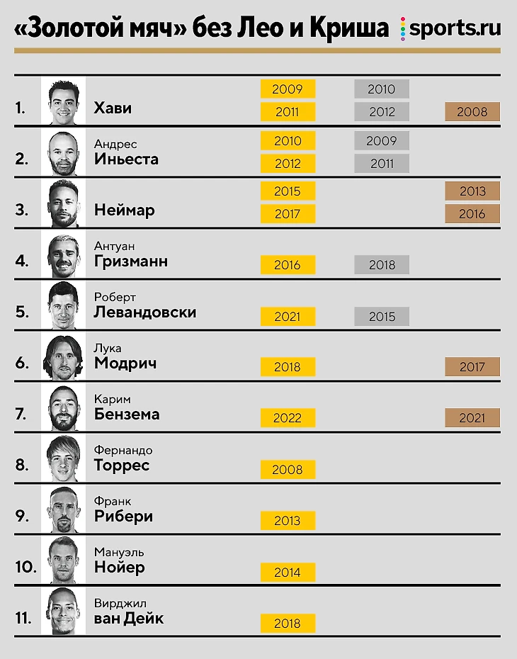 У Хави, Иньесты и Неймара по два «Золотых мяча» − подключаем медальный зачет полностью, чтобы определить лучшего.