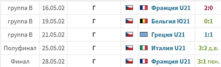 За 120 минут игры не было ни одного гола. Серия пенальти завершилась в пользу сборной Чехии 1:3. На видео (есть на Ютубе) видно, как довольно далеко от линии ворот отходит Петр Чех (тогда можно было), возможно, главный олицетворец того успеха. Летом этого же года он переберётся во Францию, а оттуда – на Туманный Альбион. Через два года многие из победителей Евро окажутся в шаге от финала взрослого Евро в Португалии.