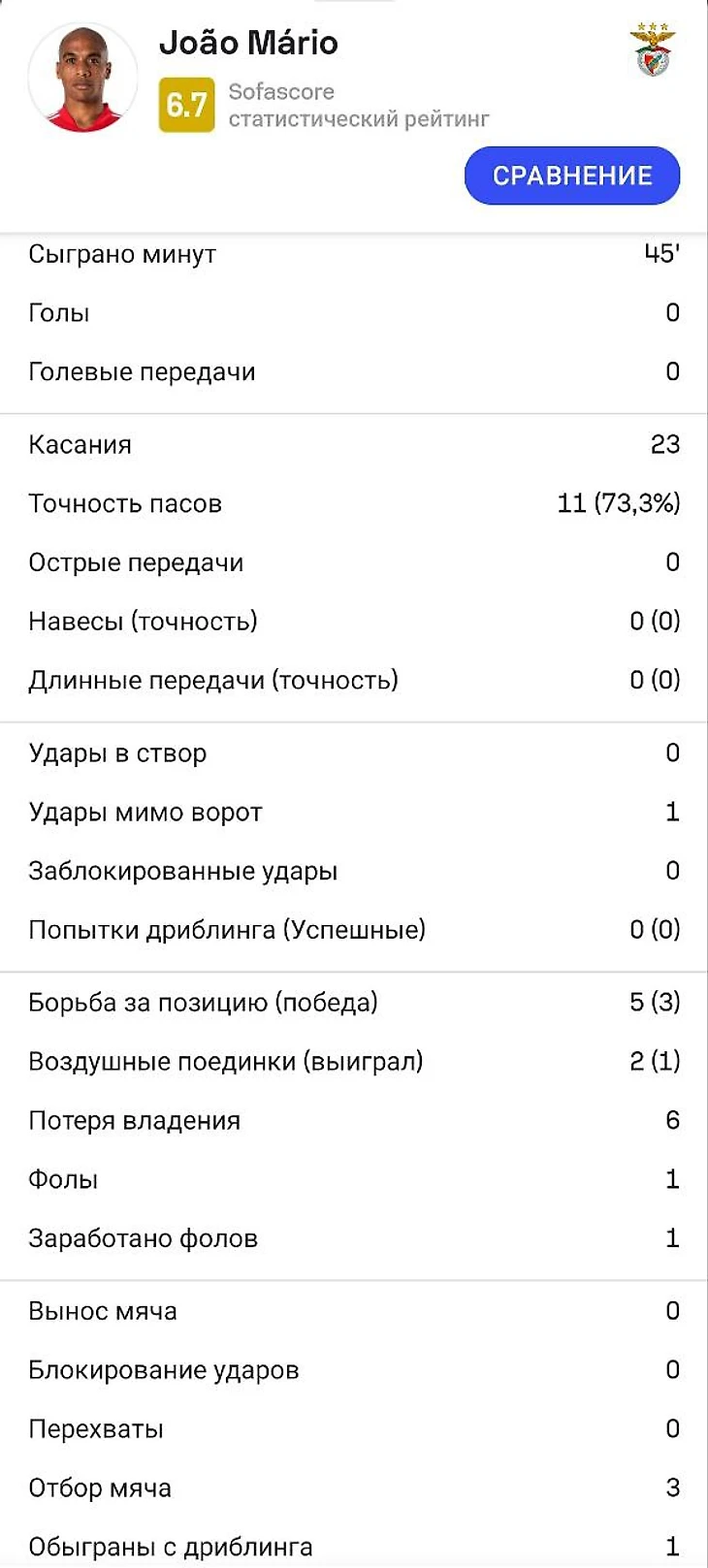 5. Жоау Мариу Жоау откровенно разочаровал. Сыграл всего 45, после чего был заменнее. Активности особой замеченно не было, нанес всего 1 удар и тот мимо. Если у него еще заберут пенки в этом сезоне, то у нас есть кандидат на мусорный пик года.(за 10 лямчиков то).