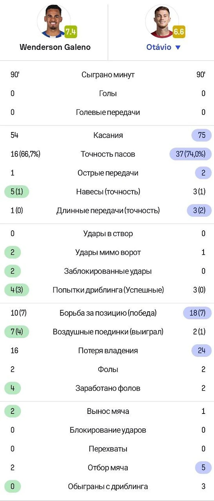 Оба играют на флангах атаки Порту. Много подключаются к атакам, и принимают самое активное участие в игре. Статистически они похожи, ценой тоже. И хотя Отавио по цифрам выдал чуть более качественный матч, гол(пускай и отмененный) забил именно Галено.
