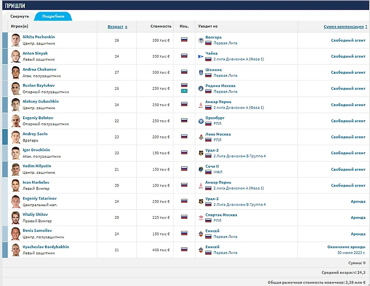 В межсезонье «Тюмень» значительно перетряхнула состав, причем традиционно для ФНЛ все трансферы – это переходы свободных агентов или аренда футболистов. Несмотря на самый скромный бюджет в лиге и самую низкую среднюю стоимость футболистов по оценке Transfermarkt, состав Тюмени показал в первых турах, что выглядит вполне сбалансированно и конкурентоспособно для уровня ФНЛ.