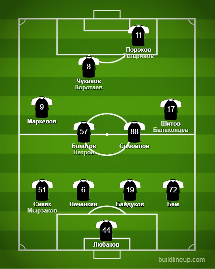 В центре полузащиты играет пара опорных Болотов-Самойлов, подменить их может Михаил Петров. По краям полузащиты в основном выходят 35-летний Иван Маркелов – слева, и арендованный у Спартака молодой Виталий Шитов – справа. В роли основного центрфорварда выступает Илья Порохов, которого может подменить опытный Антон Кобялко. Второго нападающего могут сыграть Андреа Чуканов, Евгений Татаринов и получивший травму в первом туре капитан команды Александр Коротаев. Еще одним игроком обоймы атакующих игроков является Никита Балахонцев.