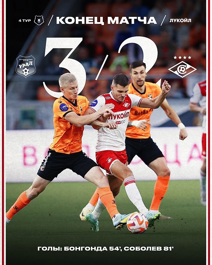 «Урал» вышел вперед в концовке первого тайма благодаря дальнему удару Даниеля Мишкича. «Спартак» отыгрался на 54-й минуте — отличился Тео Бонгонда.