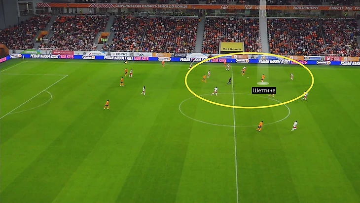 В итоге Кристофер ускорился, а Литвинов после приема Шеттине выдернулся, но уже было поздно. А дальше Мартинс смотрел на эпизод и не следил за правой от себя зоной, Умяров отыгран, Литвинов торопился назад и переключился на Дмитриева, а Шеттине легко забежал в свободную зону (Рябчук тоже поздно сориентировался).