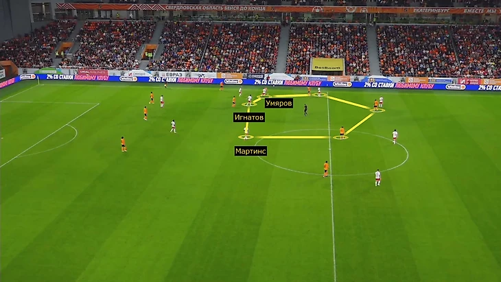 Пока не удается наладить надежность в обороне – из-за этого Литвинов играет в центре защиты, а Мартинс стал шестеркой. Дополнительные решения в середине влияют на атаку: мы уже разбирали перформансы Мозеса и Медины на позиции восьмерок. Правда, идея работает и в обратную сторону – например, против «Рубина» бросалось в глаза, что Виктор дико недорабатывает сзади во всех сценариях.