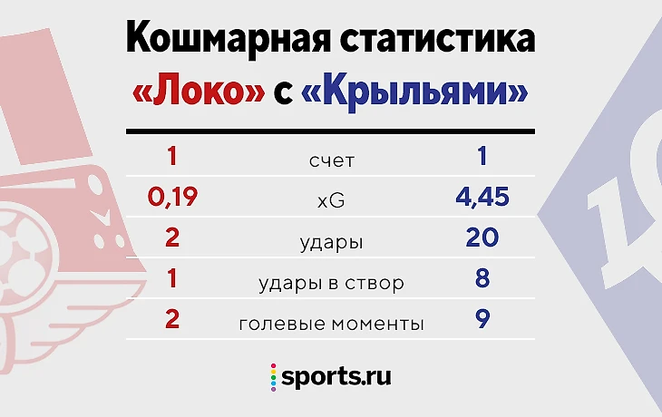 2:20 по ударам, xG меньше в 25 раз. «Локо» был намного хуже «Крыльев», но спасся на 90+3