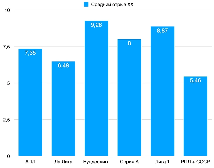Если брать во внимание только советский чемпионат, то мы получаем показатель в 3,15 очков. Это просто невероятно мало. Меньше, чем в любом другом чемпионате, который мы сегодня обозревали. Но! Если взять только Российскую Федерацию и обсчитать ее чемпионаты, то мы получаем показатель в 5,74 очка в среднем. Это наоборот – самый большой показатель в списке. То есть еще раз – в СССР был самый конкурентный в плане отрыва чемпионат, а в стране-правопреемнице самый неконкурентный чемпионат.