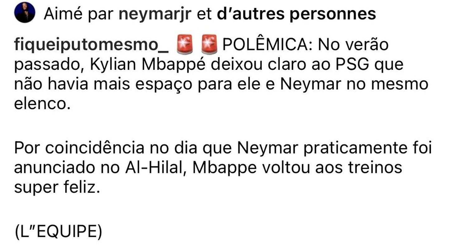 На странице FiqueiPutoMesmo выложили выдержку из статьи L’Équipe, где говорилось следующее: «Прошлым летом Килиан Мбаппе дал понять «ПСЖ», что он и Неймар не должны быть вместе в составе. По стечению обстоятельств, в тот день, когда Неймар практически перешел в «Аль-Хилаль», Мбаппе вернулся к тренировкам очень довольным».