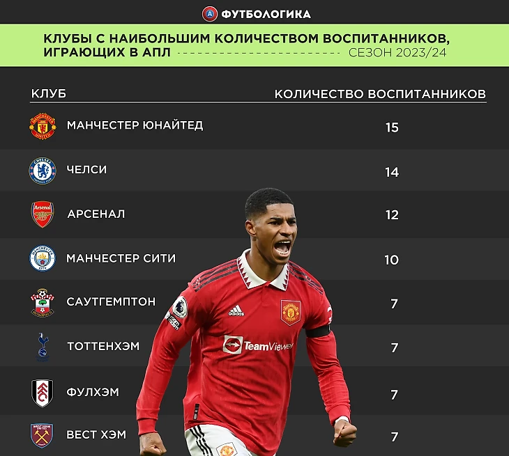 Англичан в составе – 16, собственных воспитанников – 1