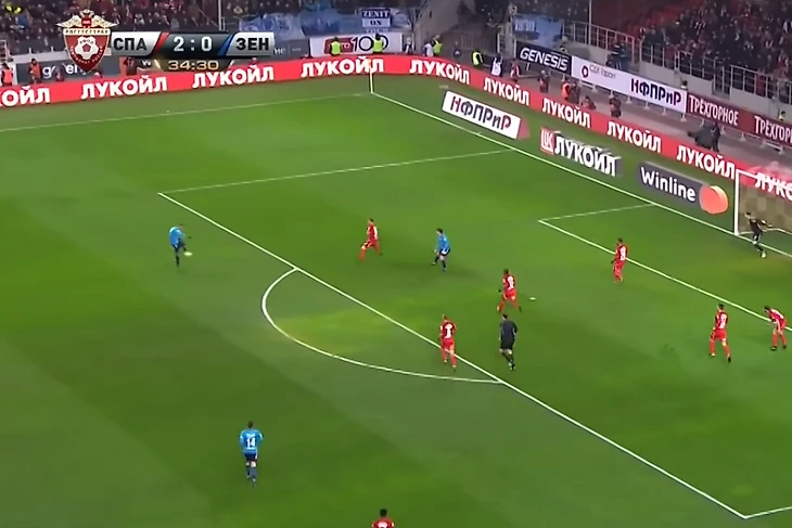 Второй гол «Спартака» через 11 минут – просто шедевр. Все началось с паса Комбарова, который увидел совсем одинокого в центре поля Адриано.