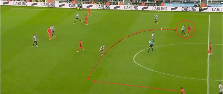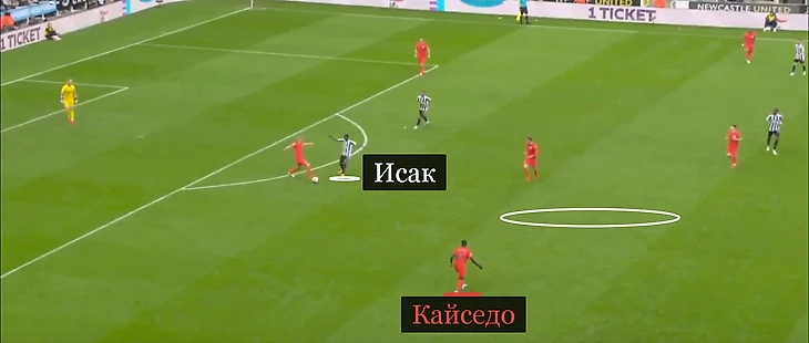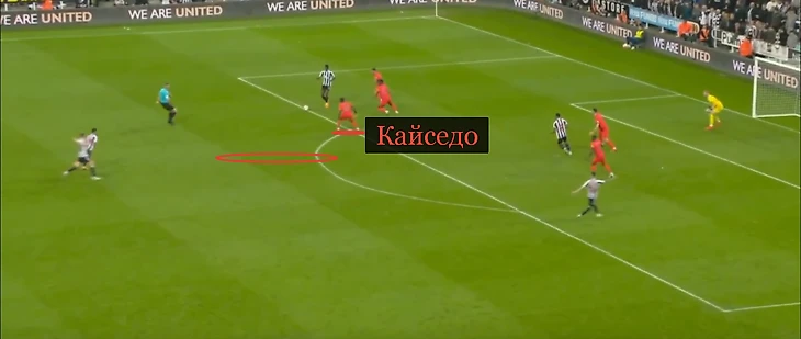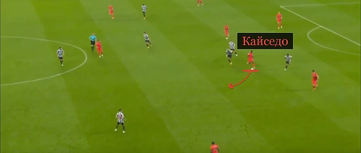 Пример из матча с «Ньюкаслом». Кайседо заметил, что Александер Исак включился в прессинг по первой линии «Брайтона», и открылся под удобный пас правой ногой.