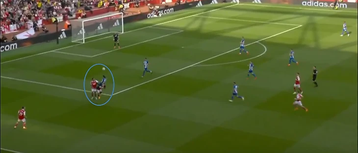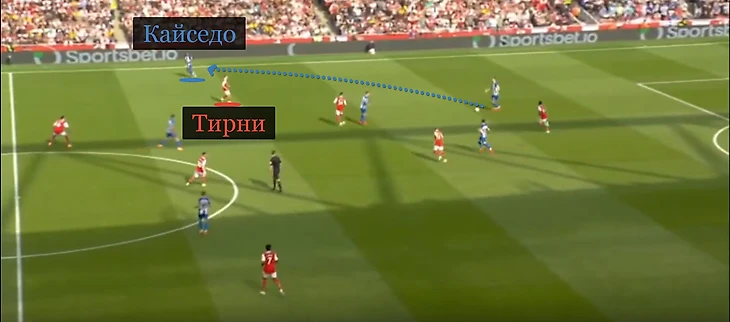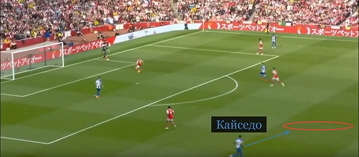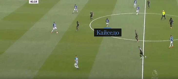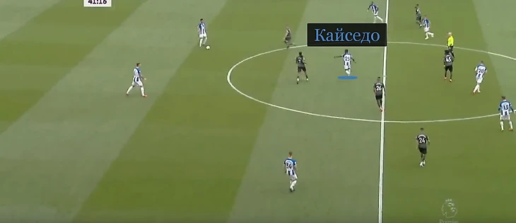 В матче с «Саутгемптоном» Кайседо задержался на чужой половине и вступил в борьбу за мяч – оказался в равных позициях с оппонентом, но быстрее подцепил владение за счет скорости. В результате ответной атаки «Брайтон» забил.