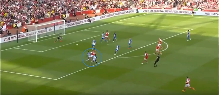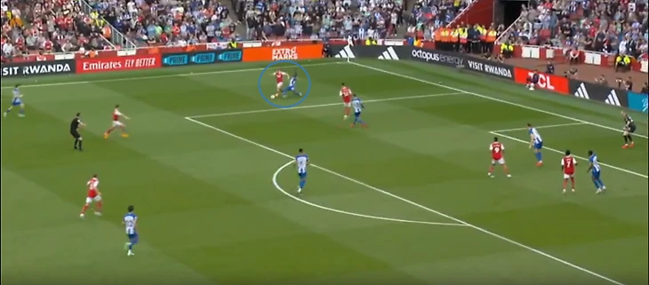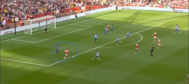 Открывания Кайседо работают и на фланге – весной 2023-го Де Дзерби как минимум трижды задействовал Мойзеса справа: в том числе в игре с «Арсеналом». Картинка ниже показывает, как эквадорец использовал невнимательность Кирана Тирни, чтобы открыться у края поля.
