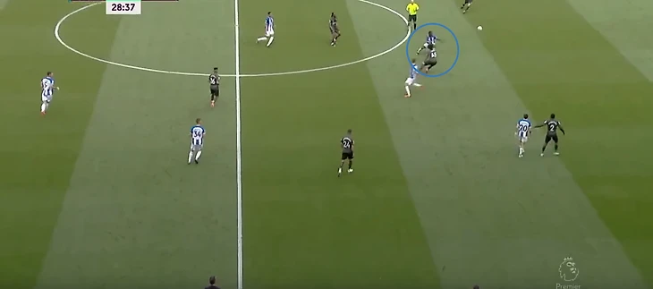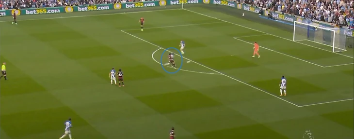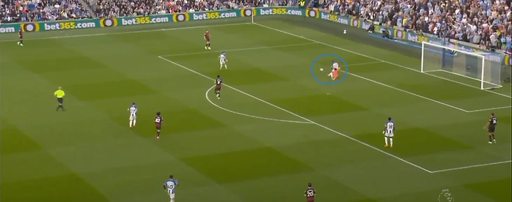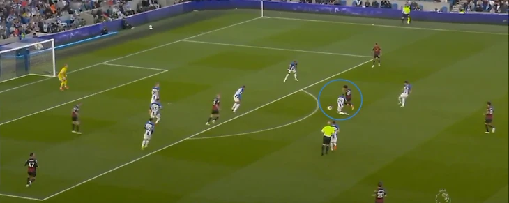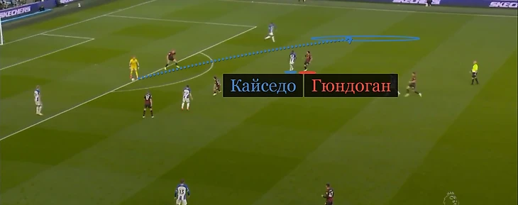 В выездной игре против «Манчестер Сити» интеллект хавбека открыл «Брайтону» путь к голу. На скриншоте видно, как Кайседо увел влево Илкая Гюндогана и открыл зону для Леви Колвилла. Защитник свободно принял мяч от вратаря и продвинул атаку, которая закончилась мячом Хулио Энсисо.