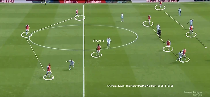 Против «ноттингемской» 4-5-1 в зоне 2 Микель Артета применил схему 3-1-3-3 (3-ромб-3), в которой Парти (ПЗ в фазе обороны) располагался между тройкой центральных защитников — Уайтом, Габриэлем, Тимбером (ЛЗ в фазе обороны) — и тройкой атакующих полузащитников — Эдегором, Хаверцем, Райсом.