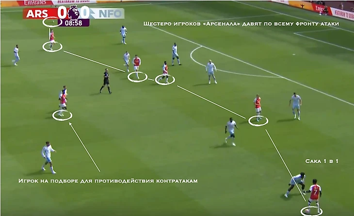 На последней линии из 5 игроков противника располагались Сака и Мартинелли по максимальной ширине поля (под изоляции 1 в 1) и Нкетиа, действовавший в зоне между тремя центральными защитниками.