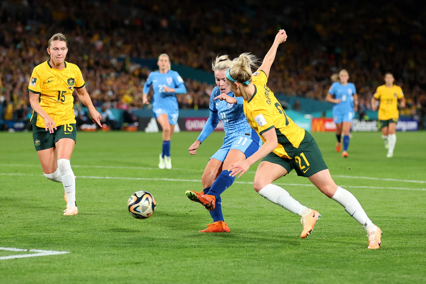 В прошлой игре «матильды» выбили с мундиаля сборную Франции в серии пенальти. Героиня серии, Маккензи Арнолд, была вне себя от счастья: «Прямо сейчас я потеряла дар речи», – сказала Арнолд в интервью ФИФА. «Я немного ошеломлена. Я бы сказала, что это лучшие дни в моей жизни. Но самое большое чувство – это безмерная гордость. Я так горжусь тем, что являюсь австралийкой – как для команды, так и для болельщиков. Это просто нереально. Это было что-то вроде американских горок. Я даже не обработала это. Я рада, что смогла сделать то, что должна была сделать для девочек. К сожалению, я не забила [свой пенальти в серии], что немного разочаровывает, и я, вероятно, буду вспоминать об этом. Но, как я уже сказала, я счастлива, что смогла сделать то, что должна была, для девочек. И то, что они сплотились вокруг меня после того, как я не забила, было нереально с их стороны.»