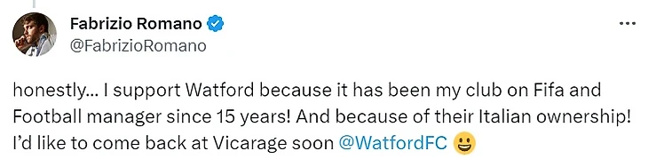 Конечно, в английском клубе не могли пройти мимо твита журналиста и пригласили его на стадион. После этого Романо несколько раз посещал матчи «Уотфорда».