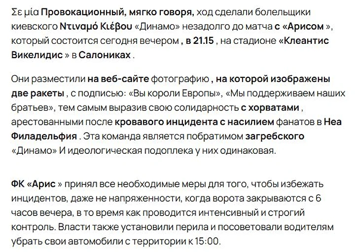 "Болельщики киевского "Динамо" перед матчем с "Арисом" в Салониках сделали провокационный, если не сказать больше, ход. Они разместили на одном из сайтов фотографию двух ракет с подписью: "BBB - короли Европы", "Мы поддерживаем наших братьев", - демонстрируя таким образом поддержку хорватам, арестованным после кровавого инцидента с насилием над фанатами в Неа-Филадельфия. Эта команда является побратимом загребского "Динамо" и имеет общую с ними нацистскую идеологию", - говорит тетенька в своем репортаже.
