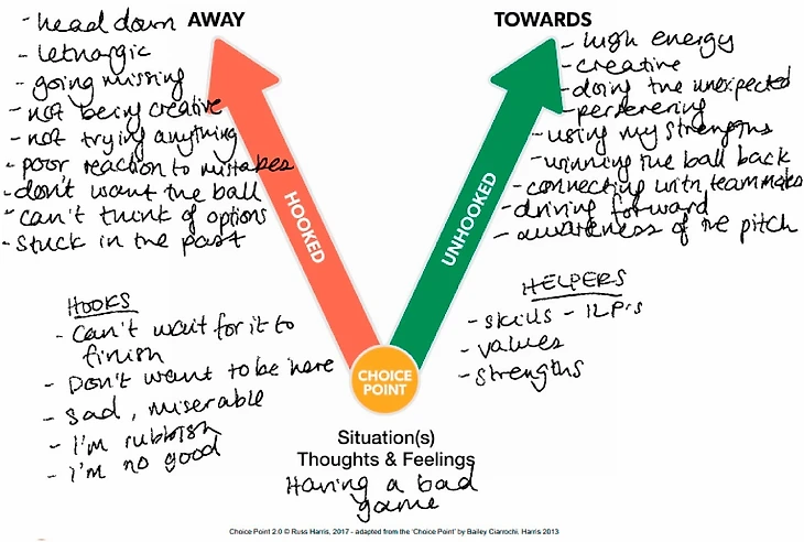 1. Определение точки выбора Здесь можно было бы долго объяснять теорию, но давайте я лучше приведу пример. У футболиста возникает выбор, когда он двигается с мячом: отдать обостряющую передачу или сыграть проще и сохранить мяч, а когда без мяча, попытаться открыться под передачу или спрятаться за спинами партнеров и соперников. По ходу исследования футболист должен был определить для себя эти точки выбора и понять, почему он принял какое-то решение в этой ситуации. Отталкиваясь от этих решений выстраивалась работа по коррекции его хода мышления. Ниже на рисунке – пример точки выбора. На одном пути "крючки", которые не будут давать футболисту развиваться, а на другом "помощники", которые и являются движущей силой в развитии.