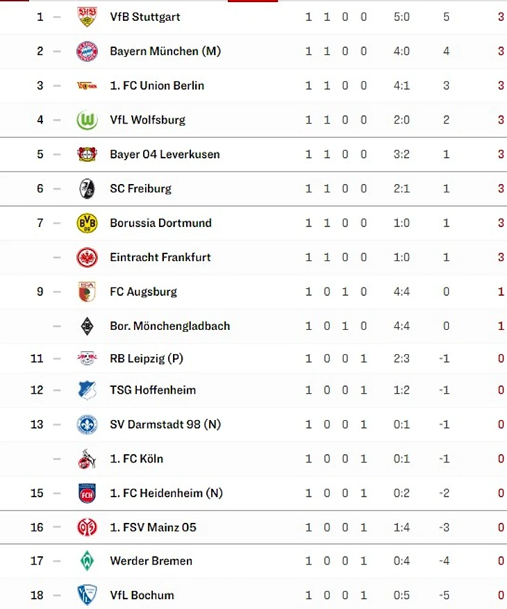 2. За 60 лет существования Бундеслиги «Штутгарт» восьмой раз занимает первую строчку в таблице после первого тура. Чаще это достижение покорялось лишь «Баварии» ― 13 раз «рекордмайстер» становился лидером лиги после первого матча.