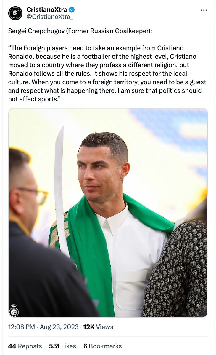 «Иностранным футболистам нужно брать пример с Криштиану Роналду, ведь это футболист высочайшего уровня! Он переехал в страну, где исповедуют другую религию, но Криштиану соблюдает все правила. Это говорит о его уважении к местной культуре. Когда приезжаешь на чужую территорию, то нужно быть гостем и уважительно относиться к тому, что там происходит. Я уверен, что политика не должна влиять на спорт».