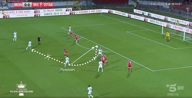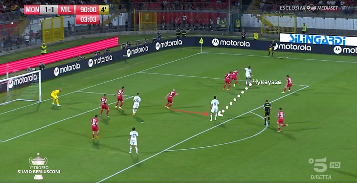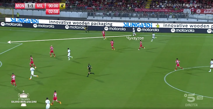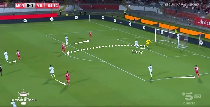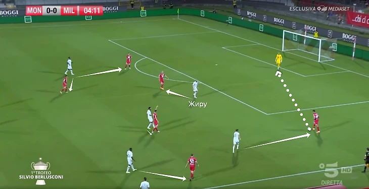 • Прессинг до вратаря (как продолжение предыдущего элемента) с попыткой отрезать направление обратного паса. Пока самый проблемный аспект – «Монца» использовала агрессию Жиру и через Кальдиролу выходила из обороны. Во втором тайме на подстраховку выдвигались восьмерки;