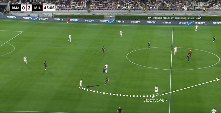 Вот один из примеров, когда в роли ложного фулбека оказался Тео. «Милан» выходил из обороны через правый фланг, где Лофтус-Чик открылся под передачу Калабрии.