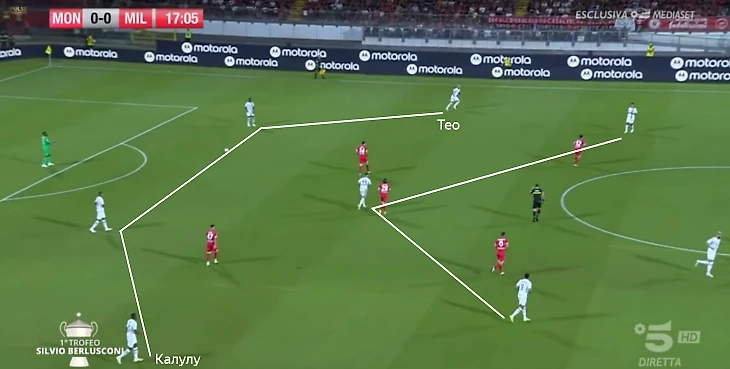 Другой способ построения – широкие позиции крайних защитников. Против «Монцы» на сборах Калулу реже уходил в центр, поэтому при владении «Милан» не отходил от 4-3-3.