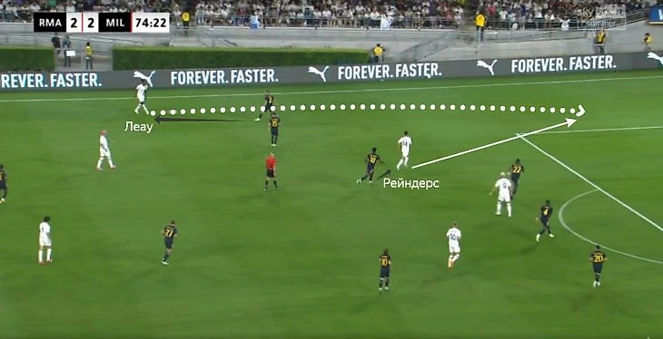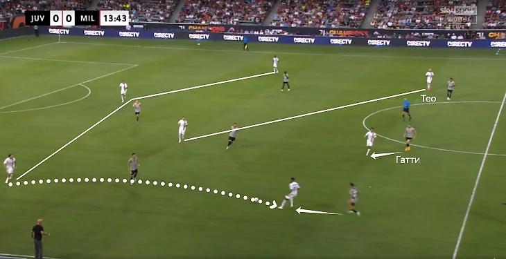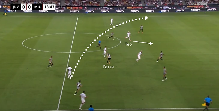Сюда сместился и Рейндерс – за ним оперативно выдернулся Гатти. Тео заметил это и рванул ему за спину. Леау выбрал сложный вариант с переводом налево (еще и неточно).
