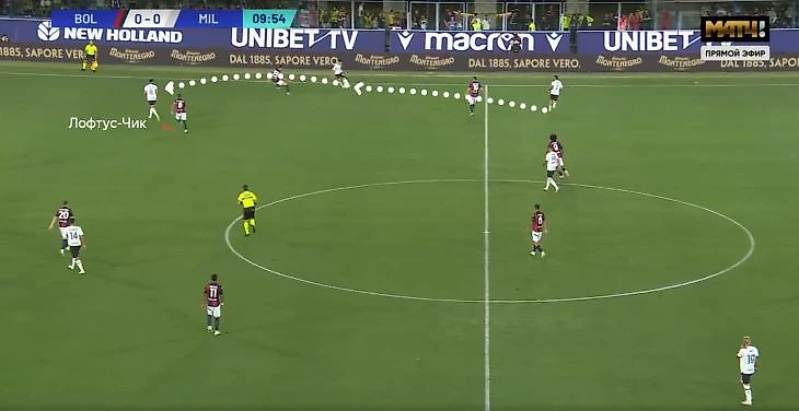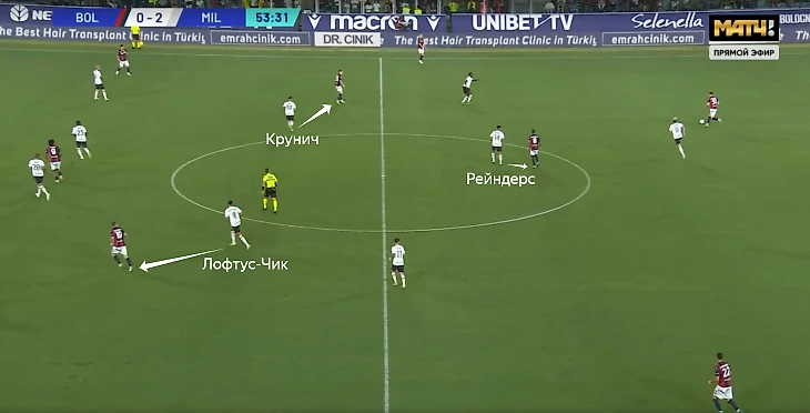 Против «Болоньи» в Серии А в этой роли вышел уже Рейндерс, а Лофтус-Чик оставался ниже рядом с Круничем. Пиоли чередовал компактный блок с периодической персональной опекой (полузащитники разбирали Домингеса, Фергюсона и Эбишера во втором тайме).