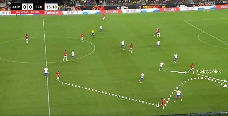 Еще один яркий эпизод – Лофтус-Чик отыгрался в центре и сразу начал рывок правее. Пулишич стянул Маркоса Алонсо и в касание вывел англичанина на удобную позицию для прострела (полузащитник «Барселоны» Лопес не накрыл его вовремя).