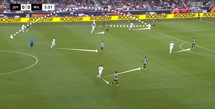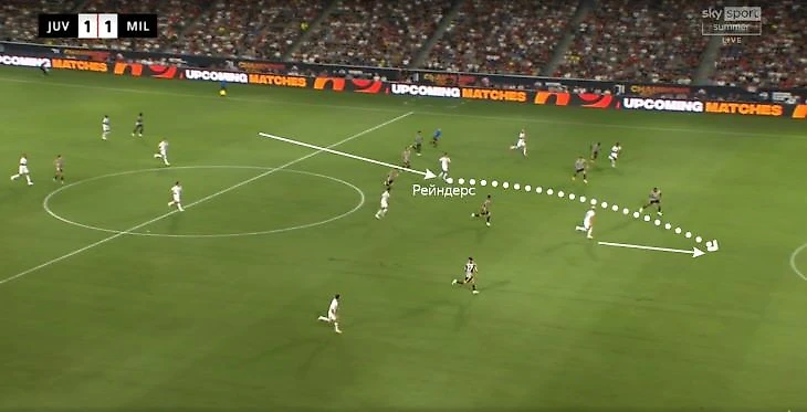 • Против двойки форвардов «Ювентуса» в предсезонке один из тройки защитников оставался свободным и мог без давления начинать атаку. Сопернику приходилось подстраиваться и выдергивать еще одного игрока в прессинг (появлялось пространство в центре).