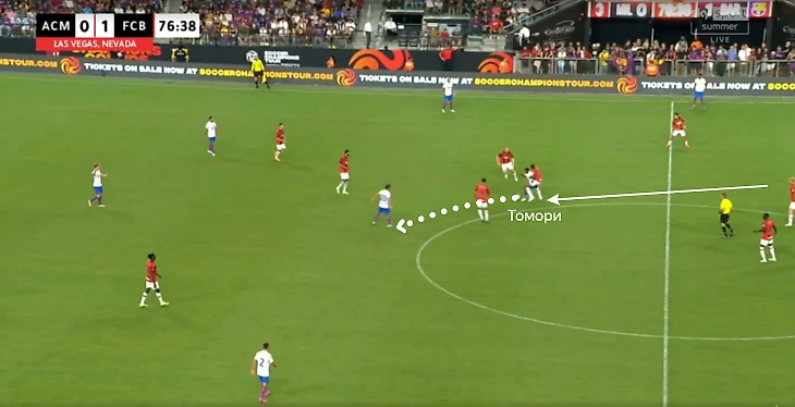 • Выходы из линии центральных защитников для единоборства (Томори заставил Фати сыграть назад);