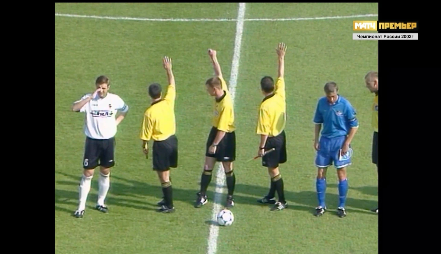 Судьи приветствуют зрителей – на матч пришли 3000 человек. Видимо, главный арбитр Алексей Тюмин поддерживает ассистентов, которые не могут поднять обе руки из-за тяжести флагов.