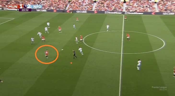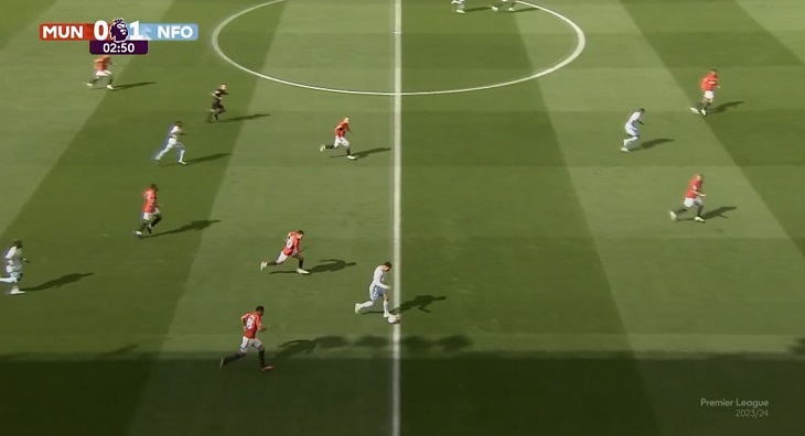 Конечно, это вынужденный и не очень показательный эксперимент: «Юнайтед» владел мячом 68% времени, «Ноттингем» мог наказывать в редких контратаках. Штрафной, с которого забили второй мяч, пришел после обреза – Каземиро физически не успевал подстраховать фланг, Далот догнал и сфолил уже у линии штрафной.