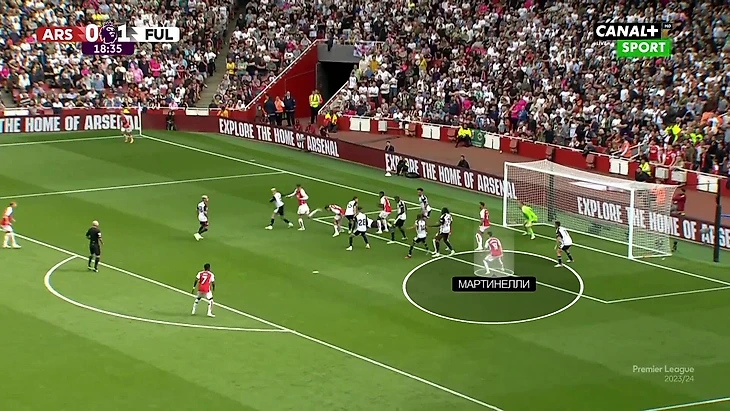 «Арсенал» атаковал зонную систему «Фулхэма», собирая четыре футболиста в одной точке на дальнем краю штрафной. В момент подачи они начинали забег: