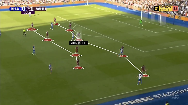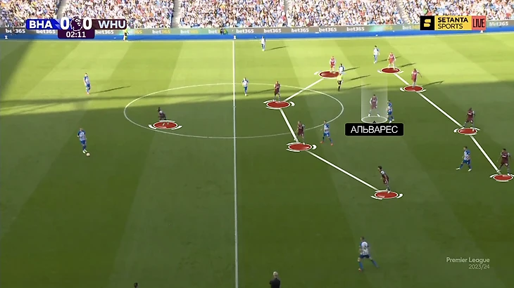 Кажется, Дэвид Мойес не просто так использовал идею именно против «Брайтона . Запуская розыгрыши, Де Дзерби целится в опорную соперника. Устроившись у чужих ворот, пытается растянуть оборону. Олицетворяет манеру Эван Фергюсон, которого Де Дзерби называет десяткой в начале атак и девяткой на последние двадцати метрах. Альварес часто ориентировался именно по нему.
